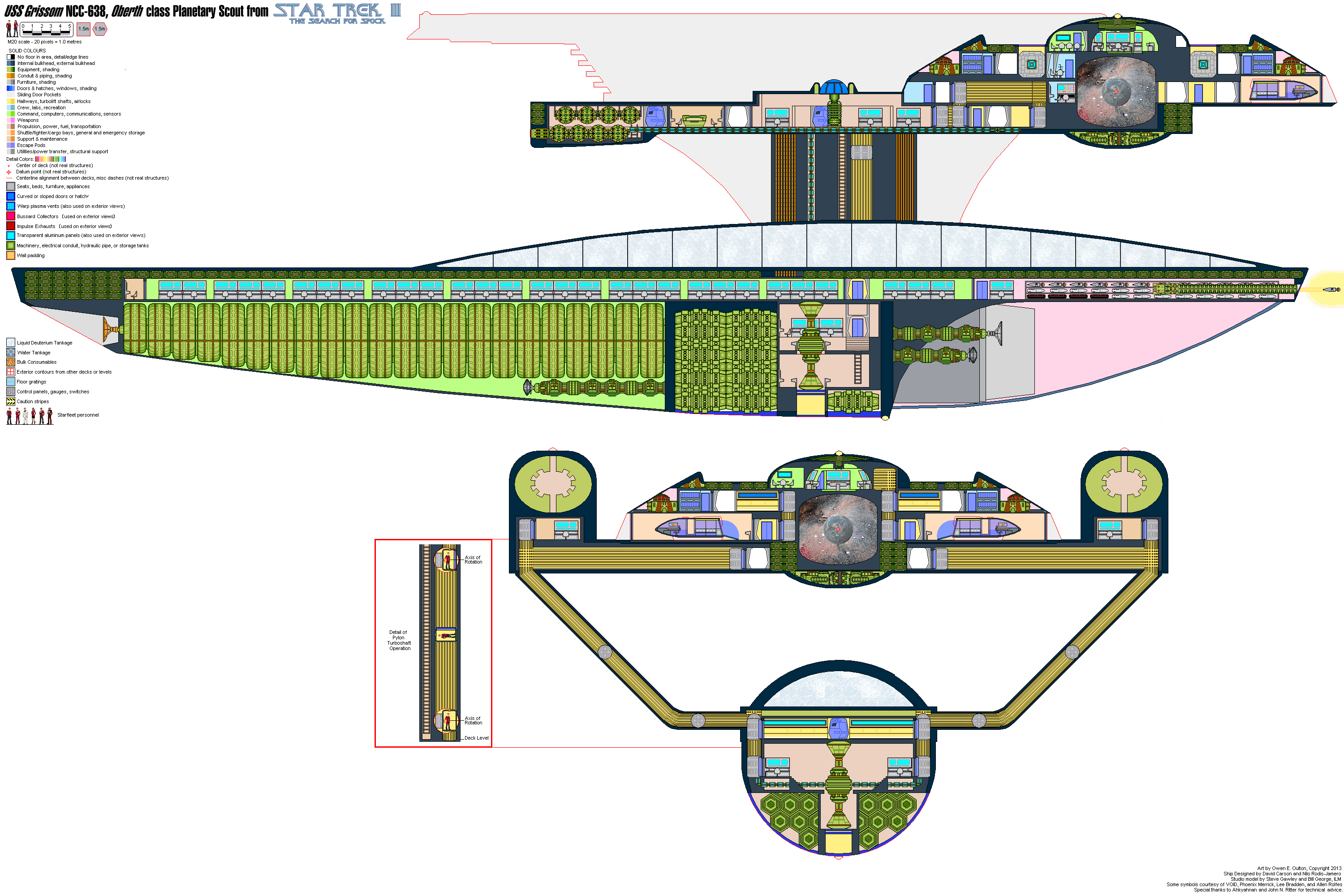 ![]() The Oberth is a small vessel with only 7 decks (well, 6½, actually). Three are in the saucer, one in the extended hull, and three in the sensor pod. Deck One houses the Bridge and Deck Two is the Crew Quarters deck. Three small shuttle hangars are on Deck Three, and Deck Four houses most of the Engineering spaces. Impulse drive is slung below Deck Four, while the Warp nacelles are mounted above either side of Deck Four. Deck Five is the main Sensor deck deck in the Sensor Pod, while Decks Six and Seven house the M/ARA and Warp Engineering - the rest is taken up by Deuterium Tanks, Antimatter Bunkers, the Deflector and the Main Sensors. |