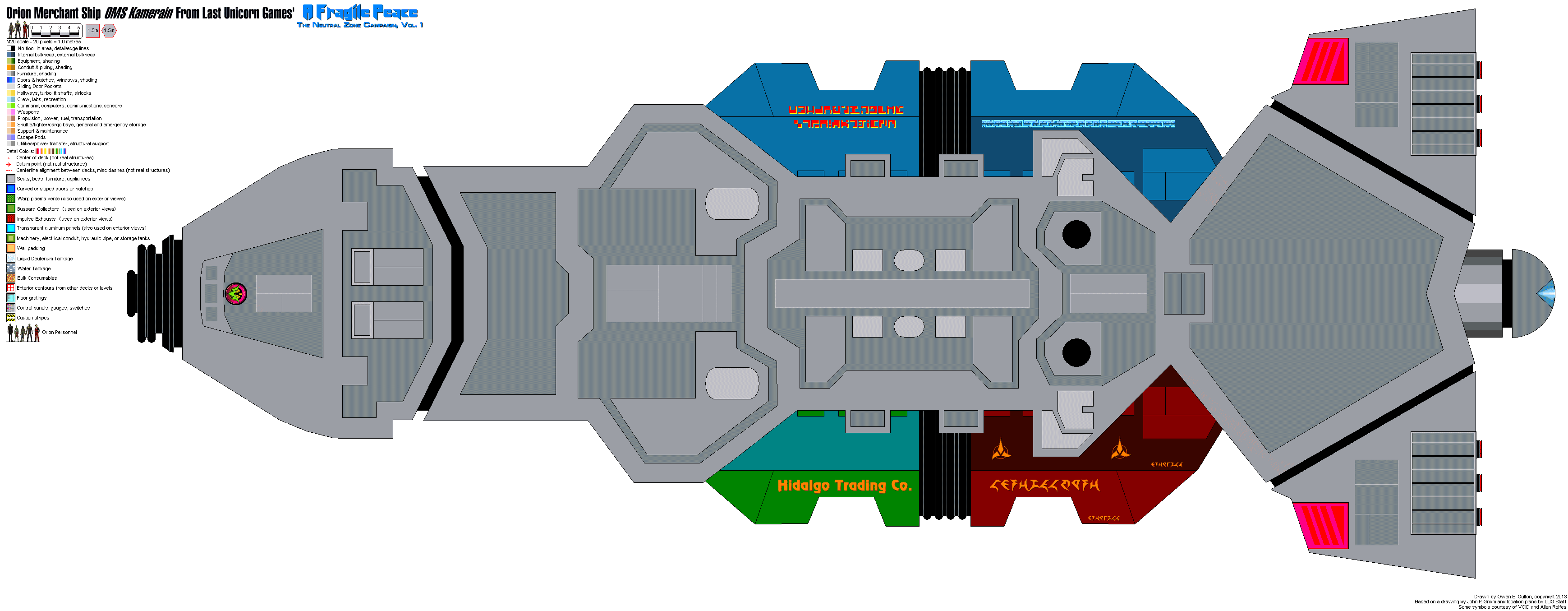 ![]() ![]() The Orion Merchant Ship OMS Kamerain was featured in Last Unicorn Games adventure module A Fragile Peace chapter 2 Aiding and Abetting. Commanded by Captain Mullio Smug, an Orion trader, the ship is described as small, looking quite dingey and seedy on the outside, showing its been though 20-odd years of hard use, but it unusually luxurious inside. Orions like their luxuries. While no class or statistics were given for the vessel, a perspective view, and exterior plan view and several small location deckplans were supplied, allowing a good idea of what the ship looked like. The perspective drawing was reprinted in the DS9 supplement Raiders, Renegades and Rogues under the Abraxas class Mercenary Corvette entry, but the stats given for the Abraxas class do not fit the description for the Kamerain, so it's just a case of using whatever art was to hand. Scaling from the details in the location plans (notably the beds in the sickbay), the ship appears to be about 158 metres, with at least 2 decks. There is a formation at the front that looks like a shock absorbtion system, so I put a large cargo airlock there. At the aft is an exposed set of coils, which I decided was the Warp nacelle. In addition to the areas shown, I added two small holosuites, a lounge, crew facilities and other details. I decided that it would be lightly armed, with a pair of forward-mounted Phaser 6's. |