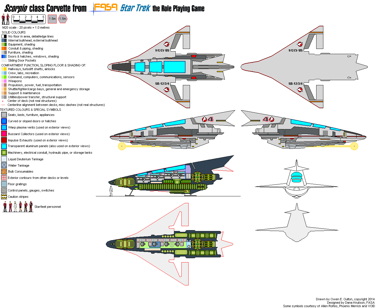 It seats four, a Pilot, Weapons Officer, Navigator and a Flight Engineer (fore to aft). Access to rations and emergency supplies is via hatches below the Weapons Officer's flight couch and to the Warp Core between the Navigator and Flight Engineer's flight couches. A small fresher is aft of the cockpit for long duration missions, and flight couches are reclinable for sleep cycles. The canopies over the flight couches may be polarised for opaqueness. The emergency supplies noted above consist of rations, spare O2 and H2O tanks, assault phaser pistols with rifle attachments, tricoders, spare communicators and multienvironmental shelters. ![]() ![]() ![]() The Scorpio class Corvette entered service in 2280, as part of the Federation's response to heightened Klingon aggression. Scorpios do not bear official names, rather Scorpio flights are named after constellations in the system in which they are stationed. Individual corvettes often do bear informal names assigned by their crews, such as Bouncing Betty or Grabthar's Hammer, and sometimes sport colourful nose art. The corvettes are organized into groups consisting of 12 ships operating in 3 flights of 4 ships each. At the present time, there are 15 operational groups with plans for an additional 45. The operational groups are assigned as follows: The 1st, 2nd and 5th Pursuit Groups at Starbase 10; the 3rd, 6th and 7th Pursuit Groups at Starbase 12; the 4th, 8th, and 9th Pursuit Groups at Starbase 20; the 1st Andorian, 10th, and 11th Pursuit Groups at Starbase 27; the 2nd Andorian, and 12th Pursuit Groups at Starbase 15; and the 13th Pursuit Group at Starbase 14. The craft shown is hull number SB-12/3/4 (Starbase 12, 3rd Pursuit Group, Corvette number 4) Grabthar's Hammer, Tellarite Lieutenant S'Ruunt commanding. |