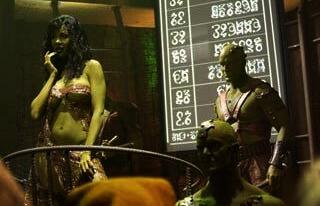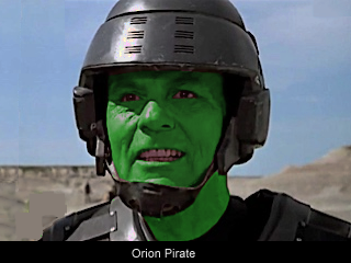 The Orions—green-skinned humanoids, the most notable of whom are the so-called "green Orion animal women," females who seem to be mere slaves but actually wield a preternatural influence over humanoid males of many species, and are therefore far more independent and powerful than appearances would indicate. Orions comprise the plurality of species that make up the criminally-bent Orion Syndicate, an organized crime cartel-cum-nation that stretches across the underbellies of many worlds on the fringes of Federation space and beyond. Because the Orion Syndicate prizes its political neutrality, particular vis-a-vis the Federation, Orions working on covert criminal missions — such as the spy who posed as an Andorian diplomatic aide named Thelev in 2267 to disrupt the Babel Conference — are expected to commit suicide rather than face capture and interrogation.