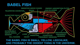 ![]() "Meanwhile, the poor Babel fish, by effectively removing all barriers to communication between different races and cultures, has caused more and bloodier wars than anything else in the history of creation." |