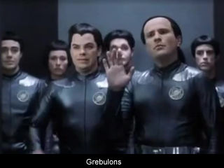 With no other options, they decided to land on the first planet they found and monitor the first thing of interest that they detected. The Grebulons landed their ship on the planet Rupert, the tenth planet in the Sol Star System, and they began to monitor all transmissions from the only planet with life in the system: Earth. The Grebulons became infatuated with Earth; eating McDonald's hamburgers, watching television, and furnishing their ship with human inventions such as waterbeds and hi-fi audio systems. In order to collect these items, they had a special box number in New Hampshire where they made regular pickups, and paid via American Express. They also became enamoured with astrology and invited the alternate Earth's Tricia McMillan to Rupert to map out their astrological horoscopes and offered her reheated chicken nuggets. ![]() In a misguided attempt, the Grebulon Leader ordered Earth destroyed before it could rise into Capricorn. As a classic Taurus, this was very ominous for him. He ended up having a bad month indeed as there were no longer transmissions from Earth to monitor. While trying to save Random from the Earth's destruction, Trillian revealed that the Grebulons are a missing reconnaissance fleet from the war that she was meant to cover; but never happened, due to the Grebulons and their army never arriving. The meteorite that struck their ship was influenced by the Guide Mark II via Reverse Temporal Engineering as instructed by the Vogons. |
