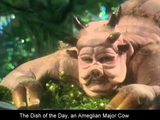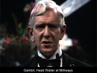 The Restaurant has some of the most staggeringly extravagant decor ever seen, a variety of the strangest guests from throughout history, and serves a particularly fine Pan Galactic Gargle Blaster. Milliways is run by an incredible arrangement of life forms from everywhen, and is the one place anywhen that serves talking food. One of the waiters is called Garkbit.