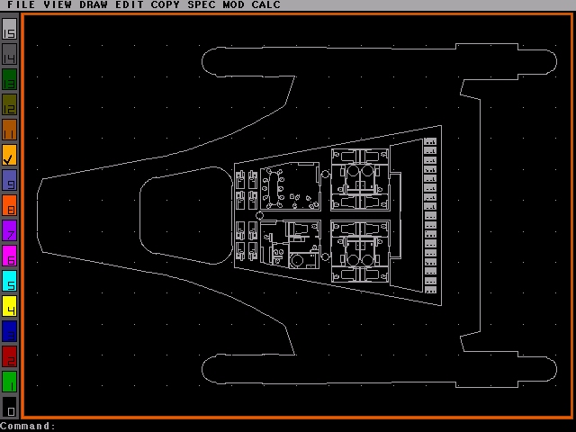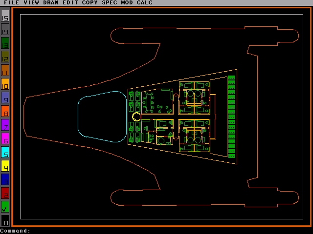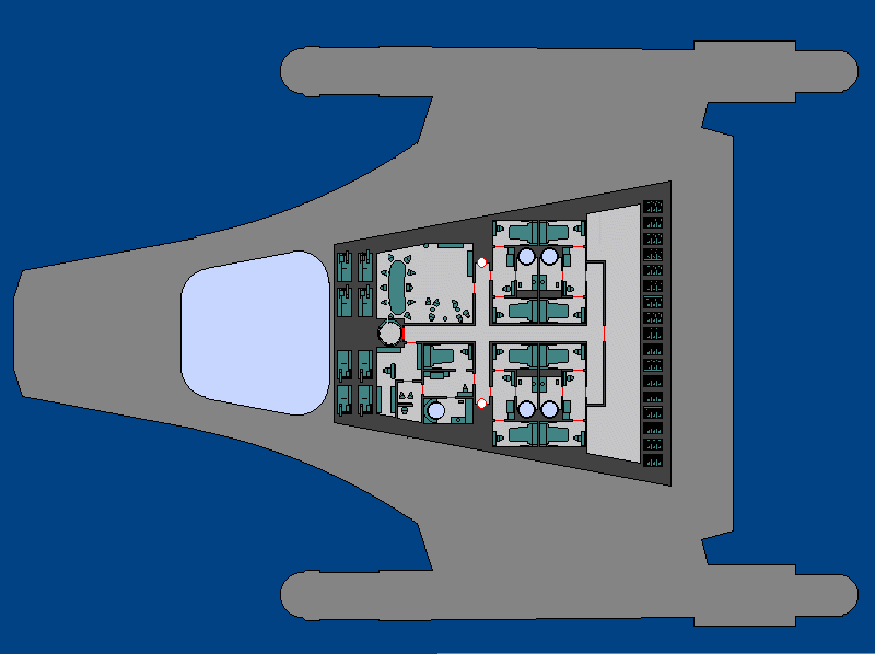 Here the image has been coloured. The colour scheme is as follows: background - blue; ship outline - medium grey; bulkheads - dark grey; decksole - light grey; doors and access panels - red; consoles, equipment and furniture - turquoise; matter/antimatter - pale green; shuttlecraft - bright blue.