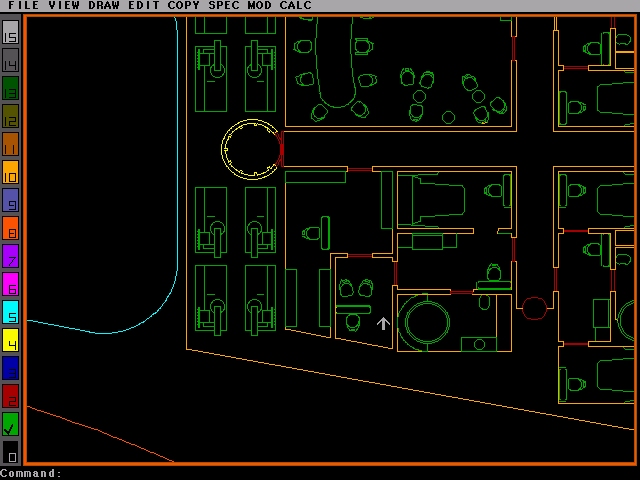 Here the deck plan has been drawn. The various colours let me know at a glance what type of components are included. The hull is orange, interior walls are amber, equipment and furniture are green and doors are red.