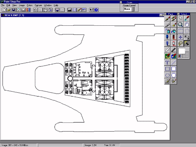 The .DXF file in then imported into Paint Shop Pro as a bitmap, to be labelled and coloured.