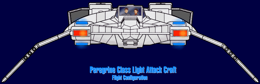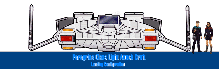 The Peregrine Class Light Attack Craft (also known the Federation Attack Fighter) is a small, 2-place warp capable shuttle optimised for combat operations. It is generally used in support of fleet actions, and may be carried aboard any starship with sufficient hangar space. Although Starfleet fields no dedicated carrier vessels, Akira Class Cruisers, with their large hangar bays, are often the platform of choice for long range transport of Peregrines.