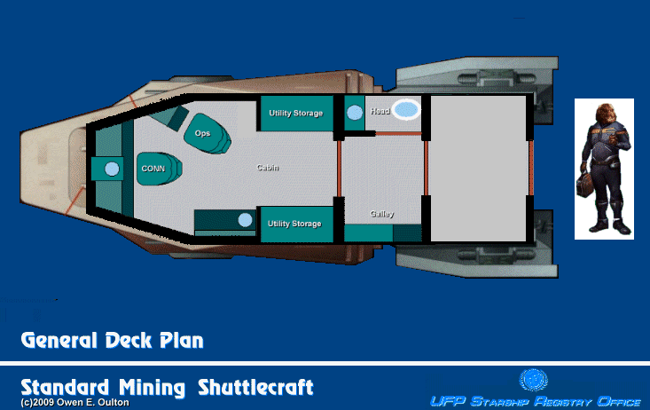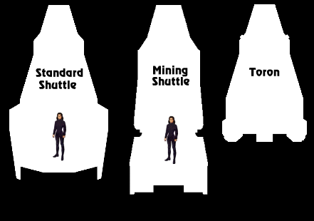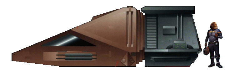 ![]() The Standard Shuttle has a hexagonal cross-section, tapering into a flattened wedge at the front. The cockpit generally has seating for two crew, and a common addition is a purpose-specific console along the portside cockpit bulkhead. The aft compartment is often used for cargo, though it can also be found outfitted as a small crew cabin or passenger compartment. The Standard Shuttle is exemplified by the Nenebek from The Final Mission and the Iyaaran shuttle from the Liaisons episode of Star Trek: the Next Generation
