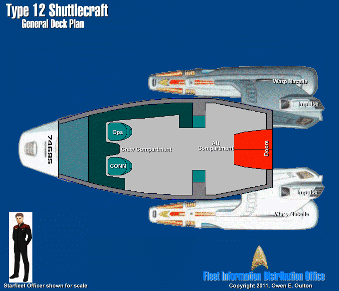 ![]() ![]() The Type 12 Shuttlecraft is boarded by means of an aft ramp. It has a 2-place transporter and a replicator, and is armed with Type IV Phasers on special operations. It has a crew of 2.