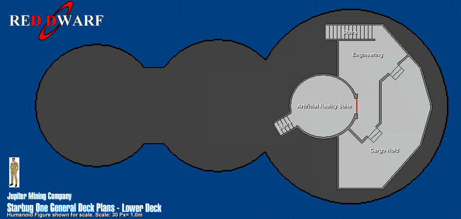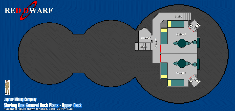 ![]() Starbug 1 has three stacked deck levels spread across its three bulbous sections. The upper deck has two double cabins in the aft section. The main deck has a cockpit up front in the forward section and a main crew lounge in the centre section. An air-lock allows entrance and egress to and from the ship. A galley projects into the aft section. The engineering areas, cargo holds and an Artificial Reality Suite take up the lower deck in the aft section. The ship is laid out so that it seems larger on the interior than it really is.