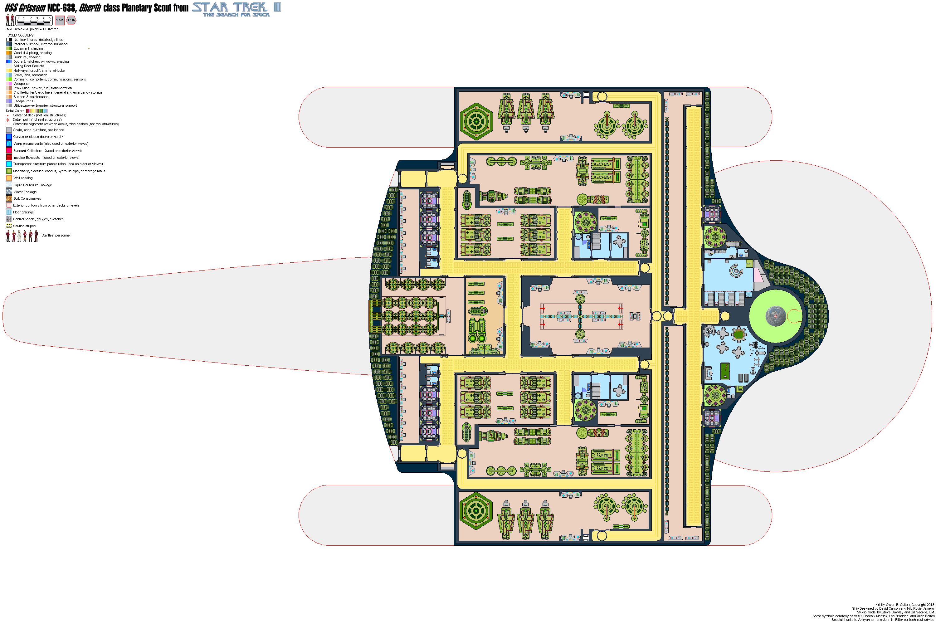 ![]() Deck 4 is the engineering deck. it contains the Impulse drive, workshops and anciliary equipment, as well as access to the ship's Warp nacelles. The ship's two airlocks are to the aft of the deck. In the centre of the deck is the Power Monitor Room with the Main Energizers topped by the twin Reaction Crystal assemblies. Forward are the Planetary Survey lab, the recreation room, the security offices and brig. This deck also carries several ASRV lifeboats. Sensor pallettes line the forward and aft edges of the deck |