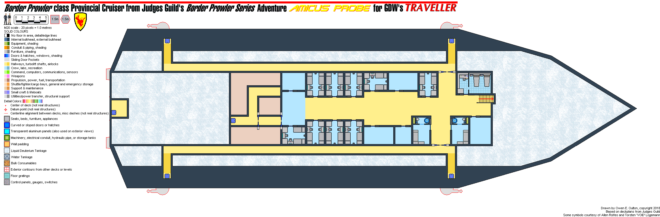 ![]() The Border Prowler class Provincial Cruisers are heavily armed warships designed for multiple missions. The normal configuration is Jump-4 capable with 200.0 tons of cargo. Removing the demountable fuel tanks reduces the range to Jump-3, but increases cargo capacity to 300 tons. The demountable tanks are mounted as two tanks, one with 46 tons of fuel, the other with 49 tons. The ship is equipped with fuel scoops and a fuel purifier. Usual armament on the ship is a Factor-2 Nuclear Damper projector, one triple sandcaster turret, four triple laser turrets organized into two batteries, two double fusion gun turrets organized as one battery, one particle accelerator Barbette, and two triple missile launcher turrets organized as one battery. A special module was built which fits in the cargo bay and provides staterooms and life support for 100 troops in middle passage. A low passage module was also built which provided for 250 men in low passage, 50 tons of equipment, and staterooms for 10 command personnel. A third module which provides passage for 20 troops, 20 tons of equipment, and semi-external carriage of a pair of 40-ton Attack Shuttles. |