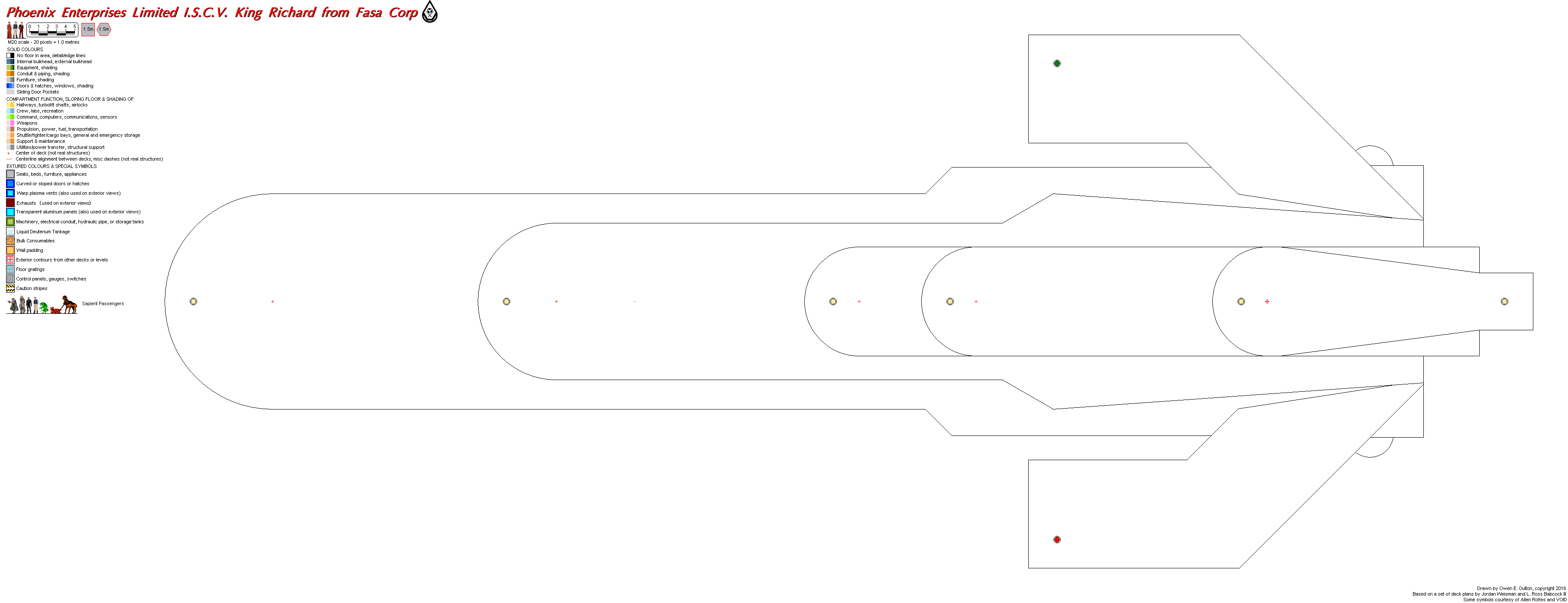 One of these sets of plans was the ISCV King Richard of Phoenix Enterprises Limited. It was a huge set of plans done to 15mm scale on sturdy white paper, allowing for the use of miniature figures in play. Also available was the companion adventure Action Aboard, which detailed 10 crew members and 19 NPC passengers, along with a page of outline plans showing the atmospheric circulation ducts.