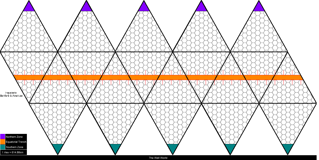 The surface of the Well World is divided into 1560 regions known as hexes. Most hexes are hexagon-shaped; a few consist of parts of hexagons joined together along other edges. Each hex is a habitat for a species of intelligent life designed by the Markovians. Except between the Northern and Southern Hemispheres, there is no physical barrier separating neighboring hexes.