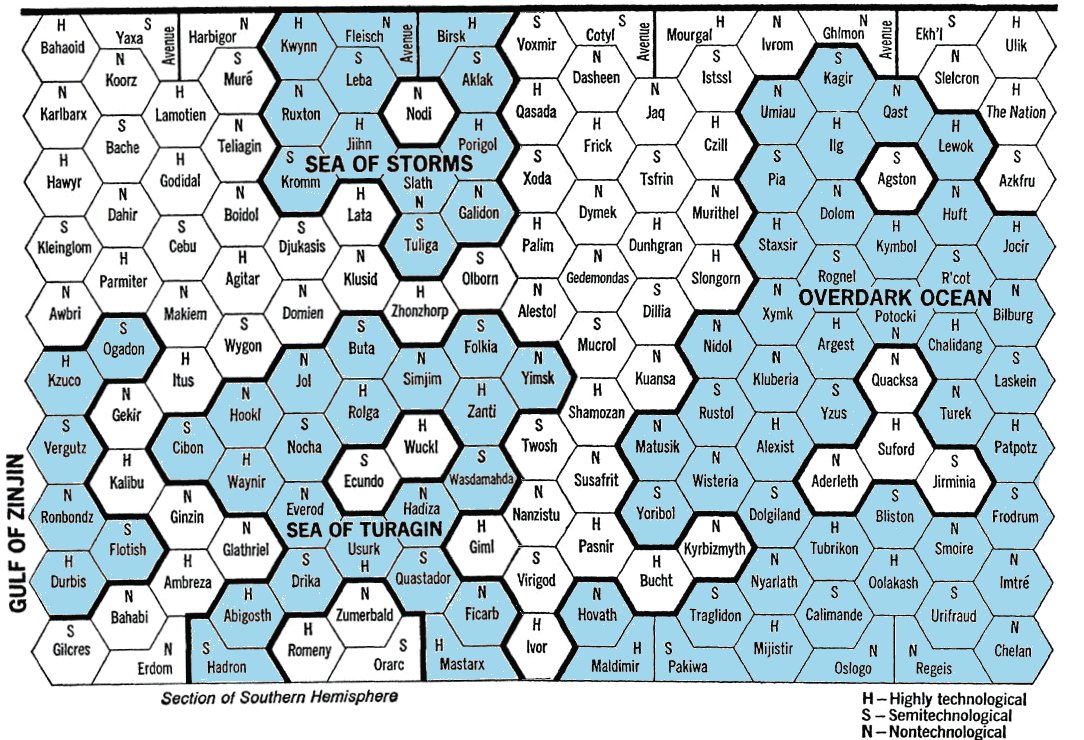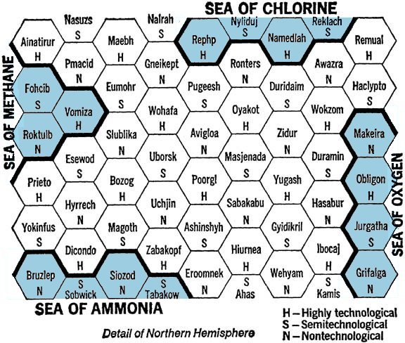The environments in the Southern Hemisphere are all based on an oxygen-nitrogen atmosphere, a water hydrosphere (if there is one), and have a temperature range that a human being can at least momentarily survive in. Of the Southern races encountered in the series to date, all but one are based on carbon chemistry in a water medium. The atmospheres of any two Southern races are likely to be compatible, such that a denizen of one hex can in most cases survive in another without any special breathing apparatus (with the obvious caveat applying to water-breathing vs. air-breathing creatures, and those from extremely-low and extremely-high temperatures).