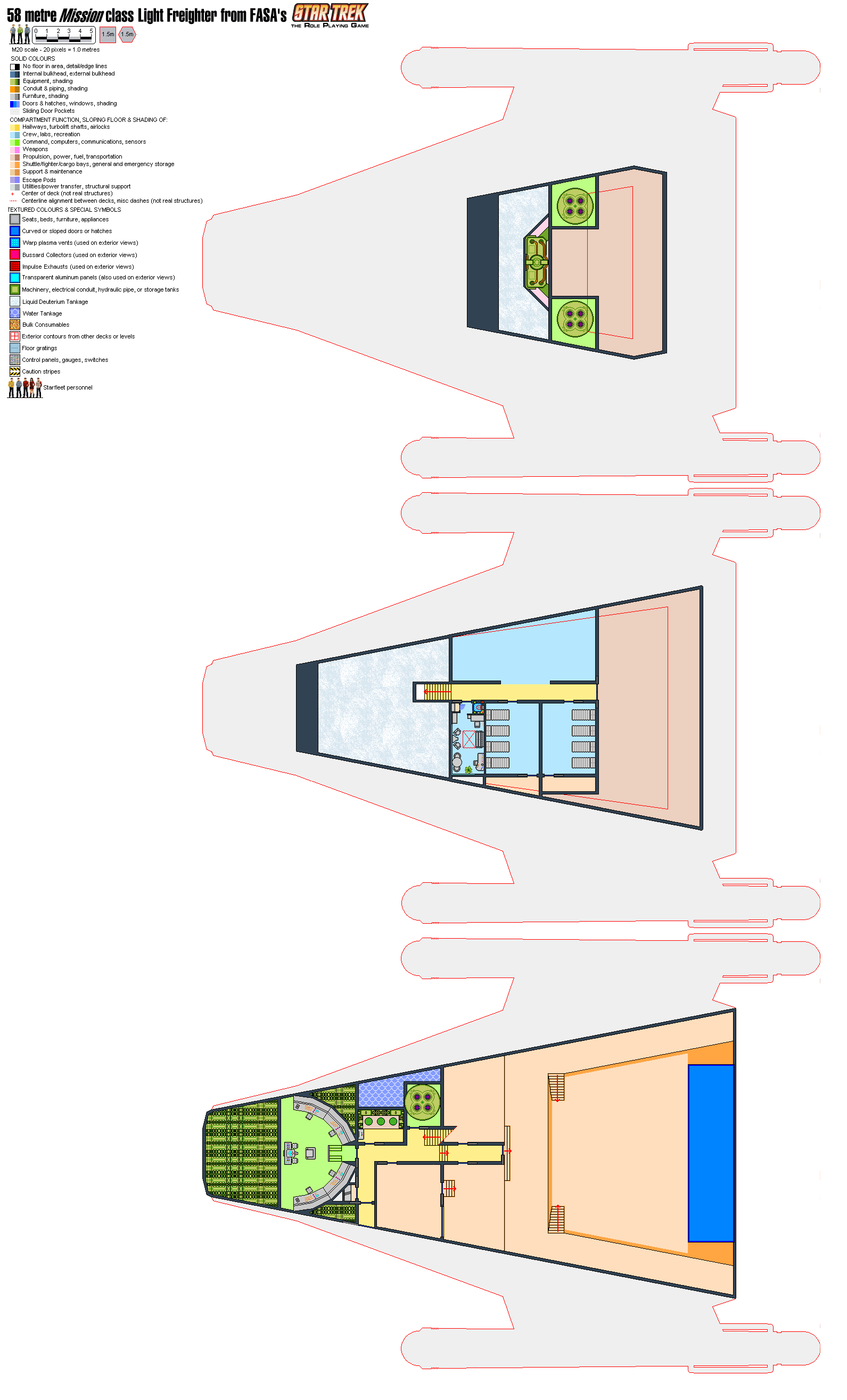 - The minimum size that can have three full decks as specified for the Mission class is 58.05m. This allows two full-height decks and the two-metre upper deck. The upper deck is still smaller than indicated in the original plans, and most of the Engineering spaces have been moved to the mid deck, with the computer moved to the lower deck. The lower deck works out to be somewhat larger than originally indicated, and the ship turns out to be rather spacious.