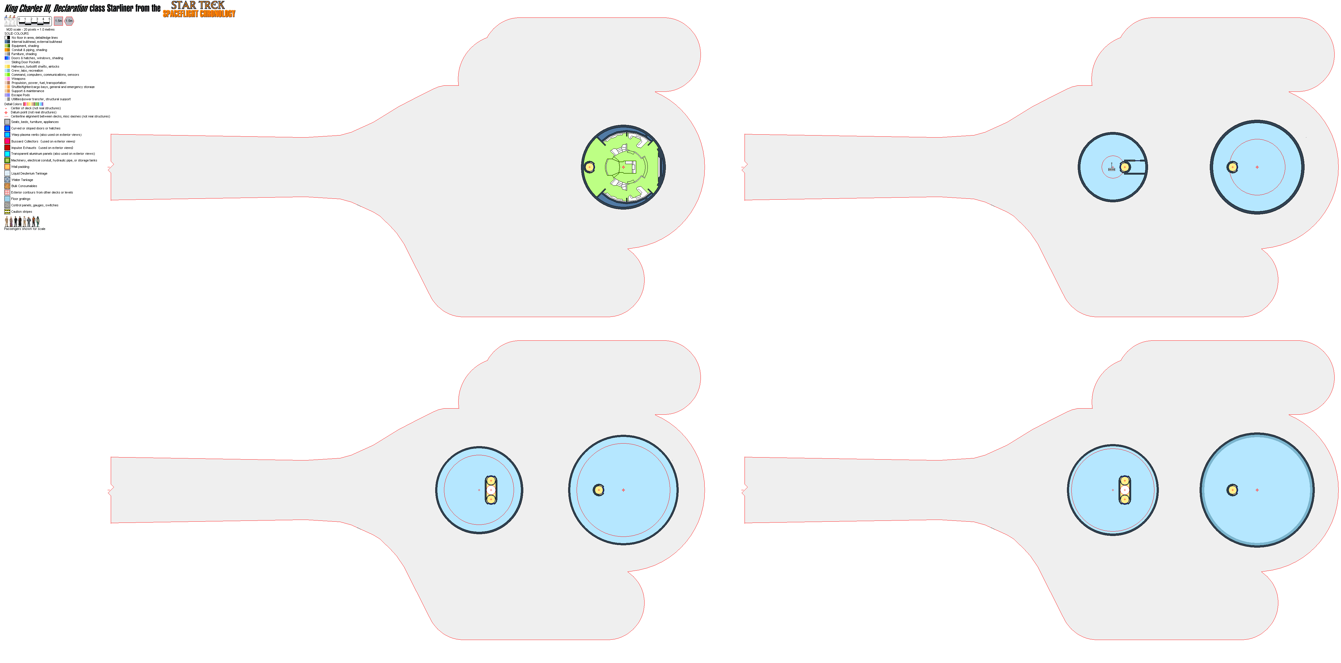 At a length of 300 metres (984') with a deck to ceiling height of 2.5 metres (8'2.4") and deck to deck being 3 metres (9'10.08"), the ship is actually quite large, having sixteen decks. Some of them are awkwardly shaped, but can be used for storage, maintenance and equipment spaces or for lifeboats. The three deck high "neck" between the Engineering section and the forward Passenger decks has two decks of lifeboats and a lower deck with liquid storage. Lifeboats are also stationed on Deck Seven. Access between decks is via a turbolift system. The portside tubular section houses a swimming pool and an arbouretum, while the starboard one houses luxury cabins. There are five classes of cabin, each capable of housing two passengers. Class A cabins have a double fold-out bed/sofa. Class B cabins have twin beds and are slightly smaller. Class C cabins are with four beds and Class D (or Steerage) cabins are smaller with two sets of bunk beds. Suites are twice the size of Class B/C cabins, have a bedroom with a king-size bed and a parlour. Class A through D have "efficiency" style freshers, while Suites have standard style bathrooms with showers.The ship carries 250 seven-place lifeboats, well over the number required.