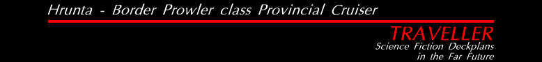 ![]() The Border Prowler class Provincial Cruisers are heavily armed warships designed for multiple missions. The normal configuration is Jump-4 capable with 200.0 tons of cargo. Removing the demountable fuel tanks reduces the range to Jump-3, but increases cargo capacity to 300 tons. The demountable tanks are mounted as two tanks, one with 46 tons of fuel, the other with 49 tons. The ship is equipped with fuel scoops and a fuel purifier. Usual armament on the ship is a Factor-2 Nuclear Damper projector, one triple sandcaster turret, four triple laser turrets organized into two batteries, two double fusion gun turrets organized as one battery, one particle accelerator Barbette, and two triple missile launcher turrets organized as one battery. A special module was built which fits in the cargo bay and provides staterooms and life support for 100 troops in middle passage. A low passage module was also built which provided for 250 men in low passage, 50 tons of equipment, and staterooms for 10 command personnel. A third module which provides passage for 20 troops, 20 tons of equipment, and semi-external carriage of a pair of 40-ton Attack Shuttles. |