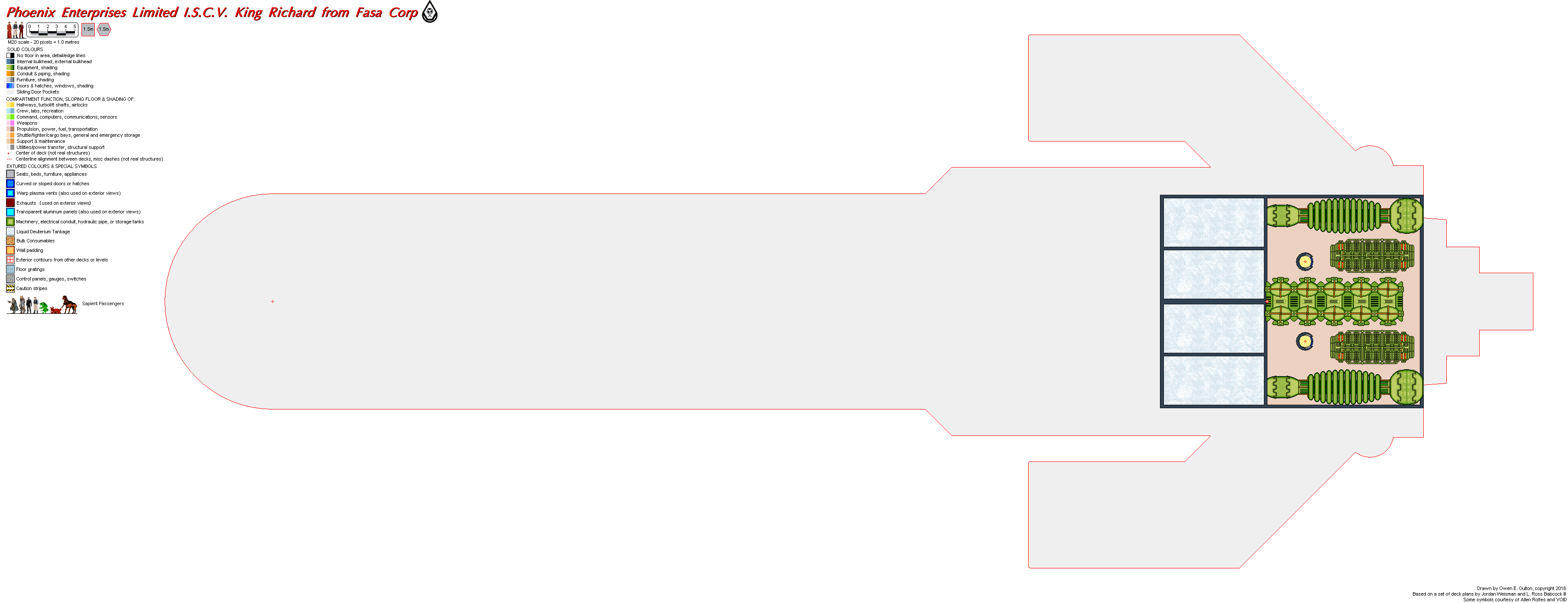 One of these sets of plans was the ISCV King Richard of Phoenix Enterprises Limited. It was a huge set of plans done to 15mm scale on sturdy white paper, allowing for the use of miniature figures in play. Also available was the companion adventure Action Aboard, which detailed 10 crew members and 19 NPC passengers, along with a page of outline plans showing the atmospheric circulation ducts.